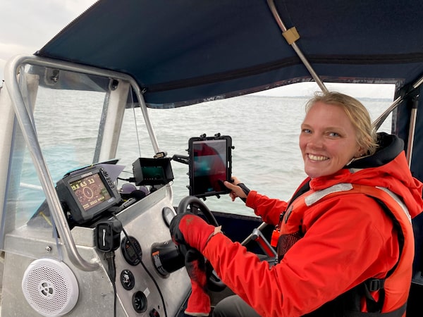 Captain Tera Lynn Ballman uses a tablet to follow the livestream of her 'beluga buddies.'Ivan Semeniuk/The Globe and Mail