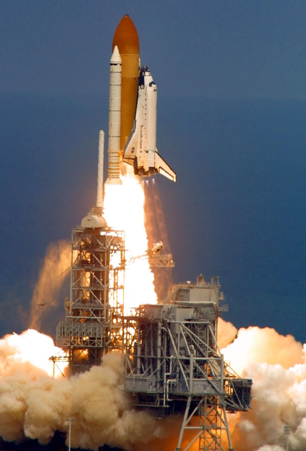 The space shuttle Endeavour, carryng the Canadarm2, clears the launch pad at the Kennedy Space Center as its journey to the ISS begins on April 19, 2001.GARY I. ROTHSTEIN/CSA