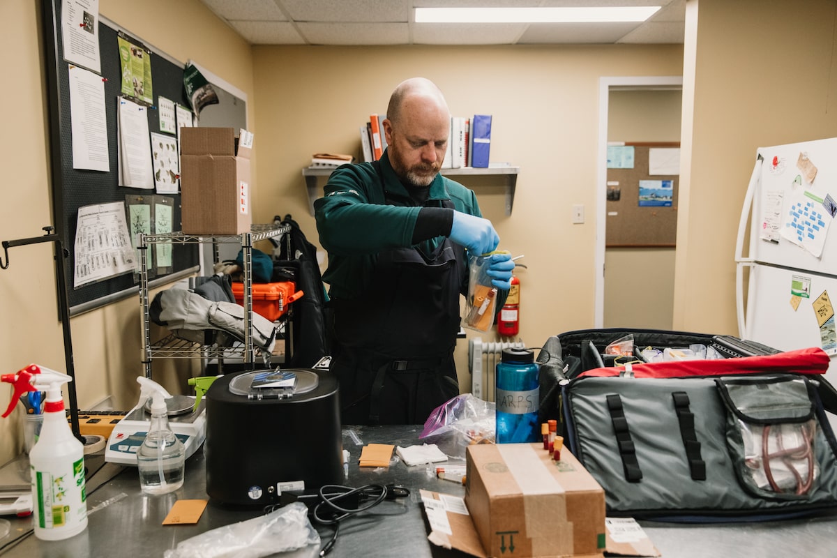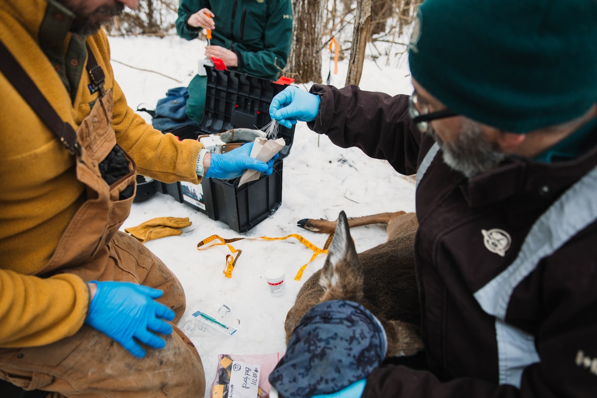 A key moment in the operation came when Dr. Shafer used a punch tool and carefully clipped a hole in the deer’s right ear. A small trickle of blood darkened the crisp white snow while he bagged and labelled the pea-sized pellet of flesh. “That gives me unlimited amounts of DNA,” Dr. Shafer said.
