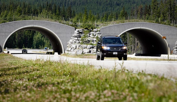 Wildlife overpasses, such as this one in Alberta's Banff National Park, aim to give animals a safe space to cross busy highways.Jeff McIntosh/The Canadian Press