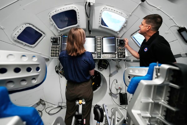Jenni Gibbons, left, and mission specialist Jeremy Hansen, both Canadian Space Agency astronauts, work in the Orion mission simulator.Ashley Landis/The Associated Press