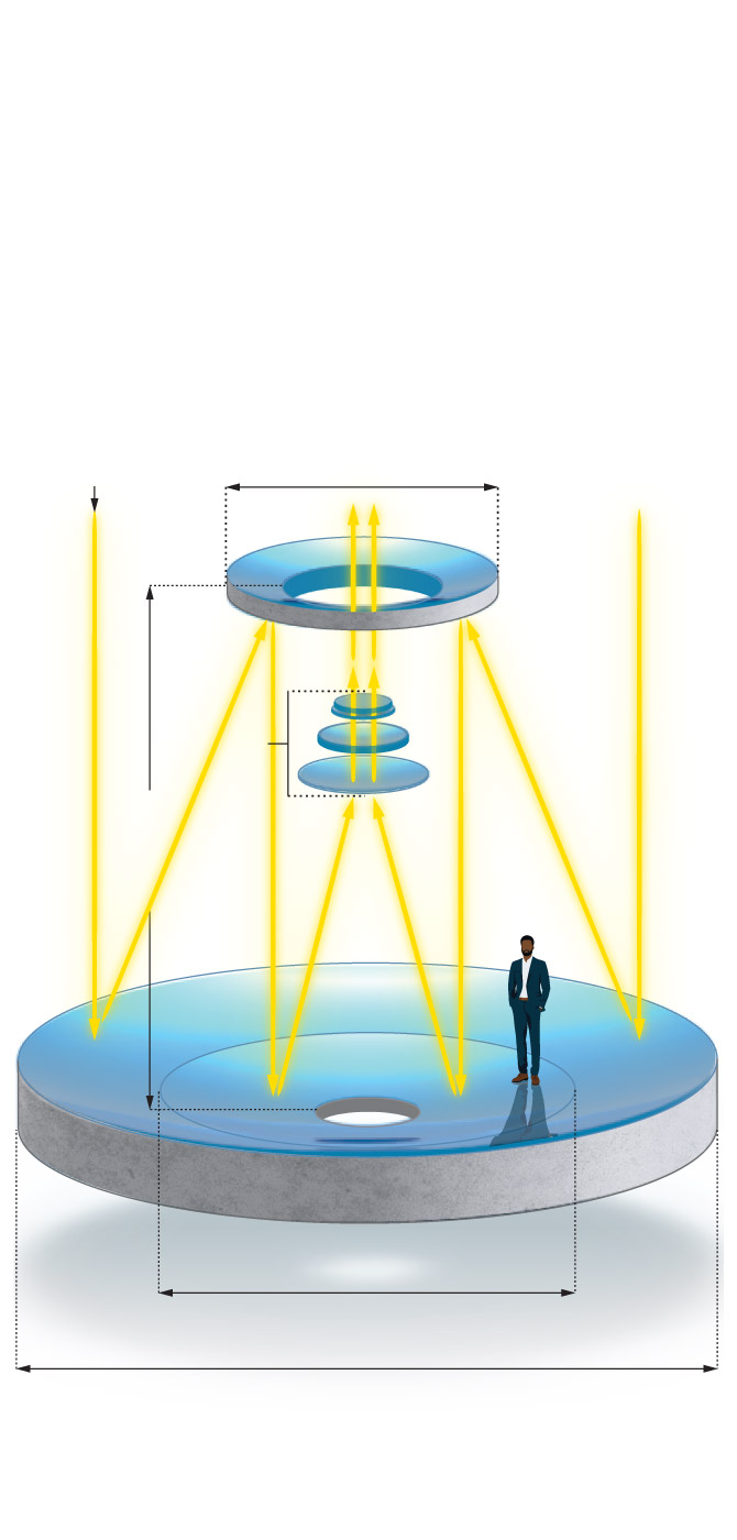 The Vera C. Rubin Observatory features a wide field telescope that can observe a region of sky 45 times larger than the full moon in area. Light entering the telescope bounces off the ring-shaped primary mirror, up to a convex secondary mirror and then back down to a third reflecting surface embedded in the first. From there, it converges on a series of lenses that guide it into a 3.2-gigapixel imager that is the world's largest camera.