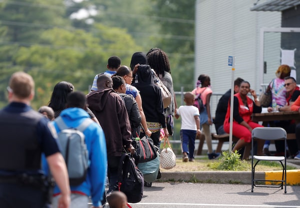 A group of asylum seekers wait to be processed after being escorted from their tent encampment to the Canada Border Services in Lacolle, Que. on August 11, 2017.Christinne Muschi/Reuters