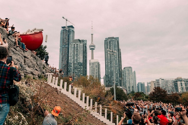 Thousands of people came out to watch; the crowd issued a roar of excitement as the dominoes crested a hill in the adjacent Canoe Landing Park and tumbled down toward The Bentway, moving toward the future of public space.