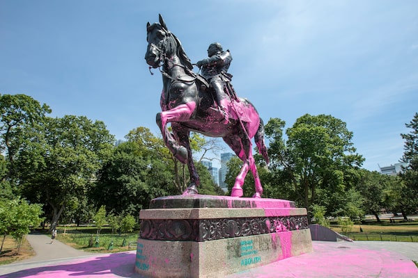 Demonstrators threw pink paint on a King Edward VII Equestrian Statue at Queen’s Park in Toronto on July 18, 2020.Carlos Osorio/The Canadian Press