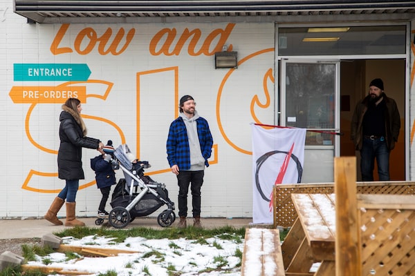 Adam Skelly, middle, owner of Adamson Barbecue, smiles as his business stays open for indoor dining despite a reintroduction of COVID-19 restrictions in the Etobicoke suburb of Toronto, on Nov. 24, 2020.CARLOS OSORIO/Reuters