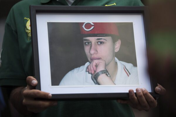 A photo of Sammy Yatim is held by one of the teen's friends at a Toronto courthouse after the sentencing of Const. James Forcillo on July 28, 2016.Michelle Siu/The Canadian Press