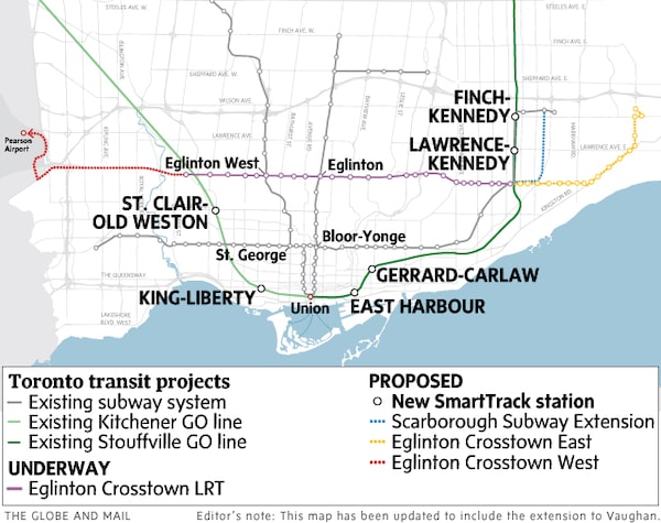 The concerns were later validated by city and consulting staff. As a result, the city opted to extend the Crosstown light-rail line toward the airport instead of tunnelling for new heavy-rail tracks. Mr. Tory now points to the extra stations this will involve, likely around 10, to argue that critics are low-balling the true scope of his transit proposal.