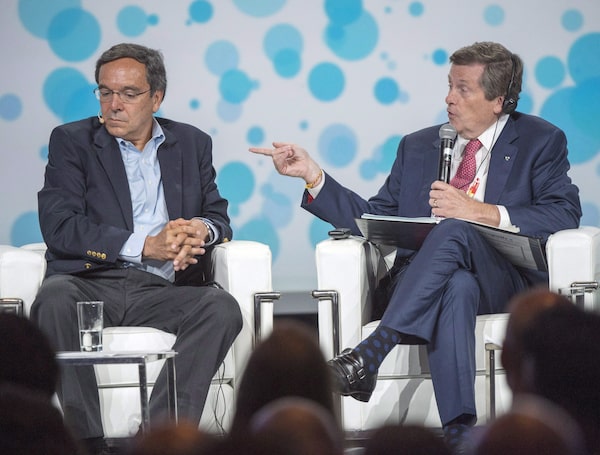 Toronto Mayor John Tory, right, and Gil Penalosa, founder and chair of 8 80 Cities, take part in a panel discussion at the XII Metropolis World Congress in Montreal in 2017.Ryan Remiorz/The Canadian Press