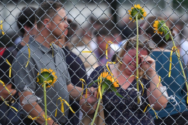 A woman weeps as mourners tie yellow ribbons and flowers to a fence after a public vigil for Karolina Huebner-Makurat in Toronto on July 17, 2023.Chris Young/The Canadian Press