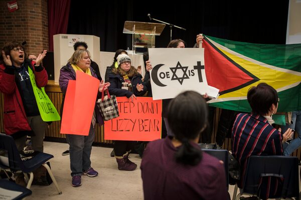 People disrupt the official swearing-in ceremony of the York School Board of Trustees at Aurora High School on Dec. 3, 2018.Tijana Martin