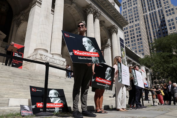 Supporters of author Salman Rushdie attend a reading and rally to show solidarity for free expression at the New York Public Library in New York City on Aug. 19.BRENDAN MCDERMID/Reuters