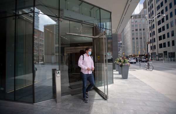 A man leaving the condominium entrance to the Shangri-La Hotel in Toronto and its residences, is photographed on July 27 2020.Fred Lum/The Globe and Mail