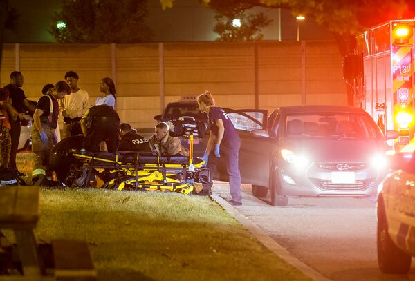 Emergency responders tend to a female shooting victim on Replin Road in Toronto on June 24, 2018.John Hanley/The Globe and Mail