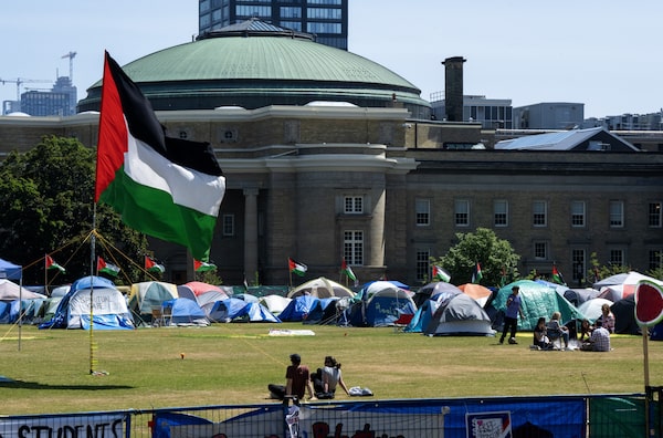 A Palestinian flag flies over the pro-Palestinian encampment set up in front of Convocation Hall at the University of Toronto campus, in Toronto, on May 26Frank Gunn/The Canadian Press