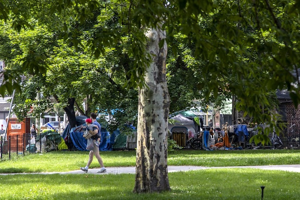 The homeless encampment at Toronto's College and Bellevue intersection is seen from the Westside Montessori School’s front yard on June 29.Tuan Minh Nguyen/The Globe and Mail