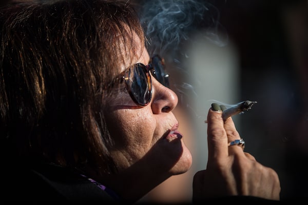 Anne Genovy smokes marijuana while celebrating the legalization of recreational cannabis in Vancouver, on Oct. 17, 2018.DARRYL DYCK/The Canadian Press