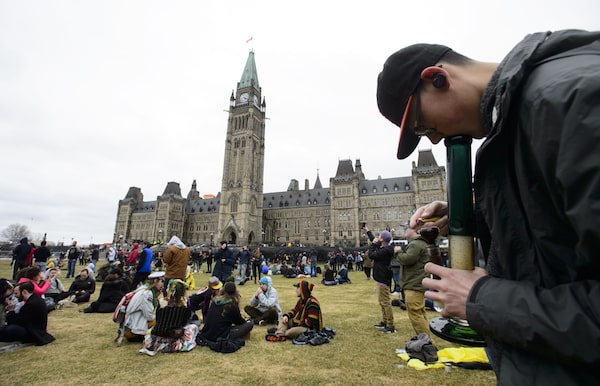 People smoke marijuana on Parliament Hill as they take part in the annual 4-20 gathering in Ottawa on April 20, 2019.Sean Kilpatrick/The Canadian Press