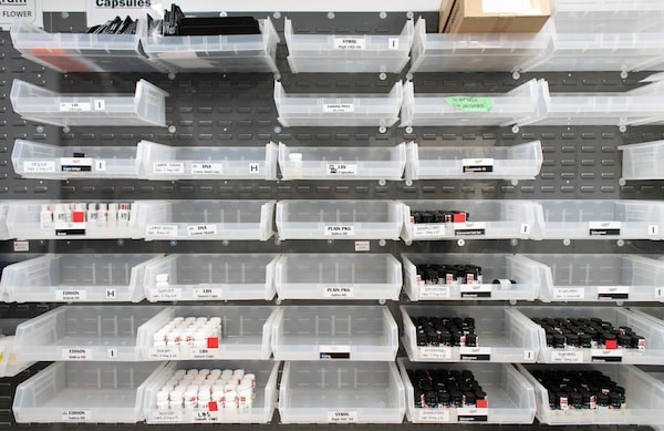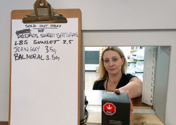 Customer experience representative Melissa McLeod, 35, hands out cannabis from the vault next to a clipboard noting all the product that is sold out.Ryan Jackson