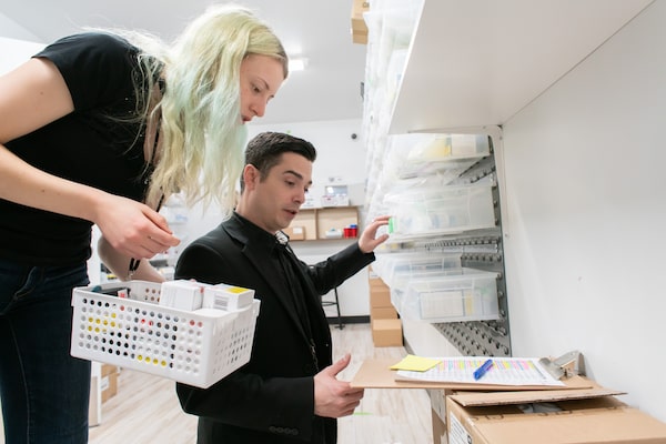 Customer experience representative Asha Stalker, 20, left, and store manager Chris Ianson counts a new shipment of cannabis.Ryan Jackson