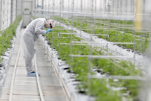 A worker checks cannabis plants at a Tilray facility in Cantanhede, Portugal, on April 24, 2019.RAFAEL MARCHANTE/Reuters