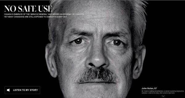 No Safe Use, a months-long project which delved into the deadly legacy of Canadians' exposure to asbestos, won a gold medal for Best Interactive Story and was also named winner of the Best Content award. No Safe Use was written by Tavia Grant and edited by Ted Mumford. It included photography and video by Louie Palu and Pawel Dwulit. Interactive design, development and production was by Christopher Manza and the multimedia editor was Laura Blenkinsop.