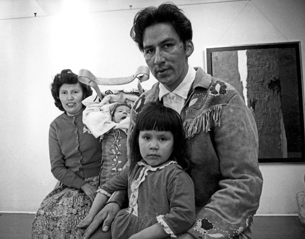 Norval Morrisseau at the Pollock Gallery in Toronto with his wife, Harriet, and children in 1964.Erik Christensen/The Globe and Mail