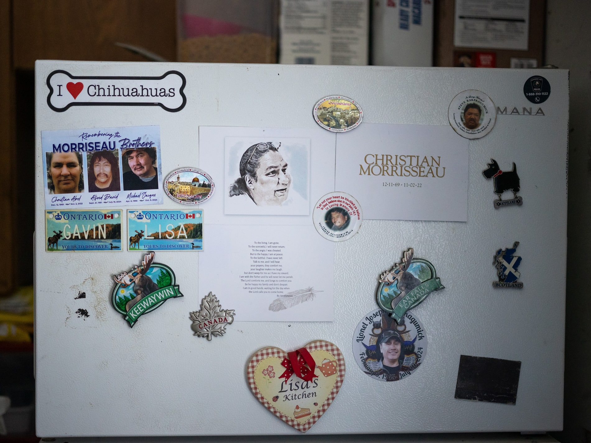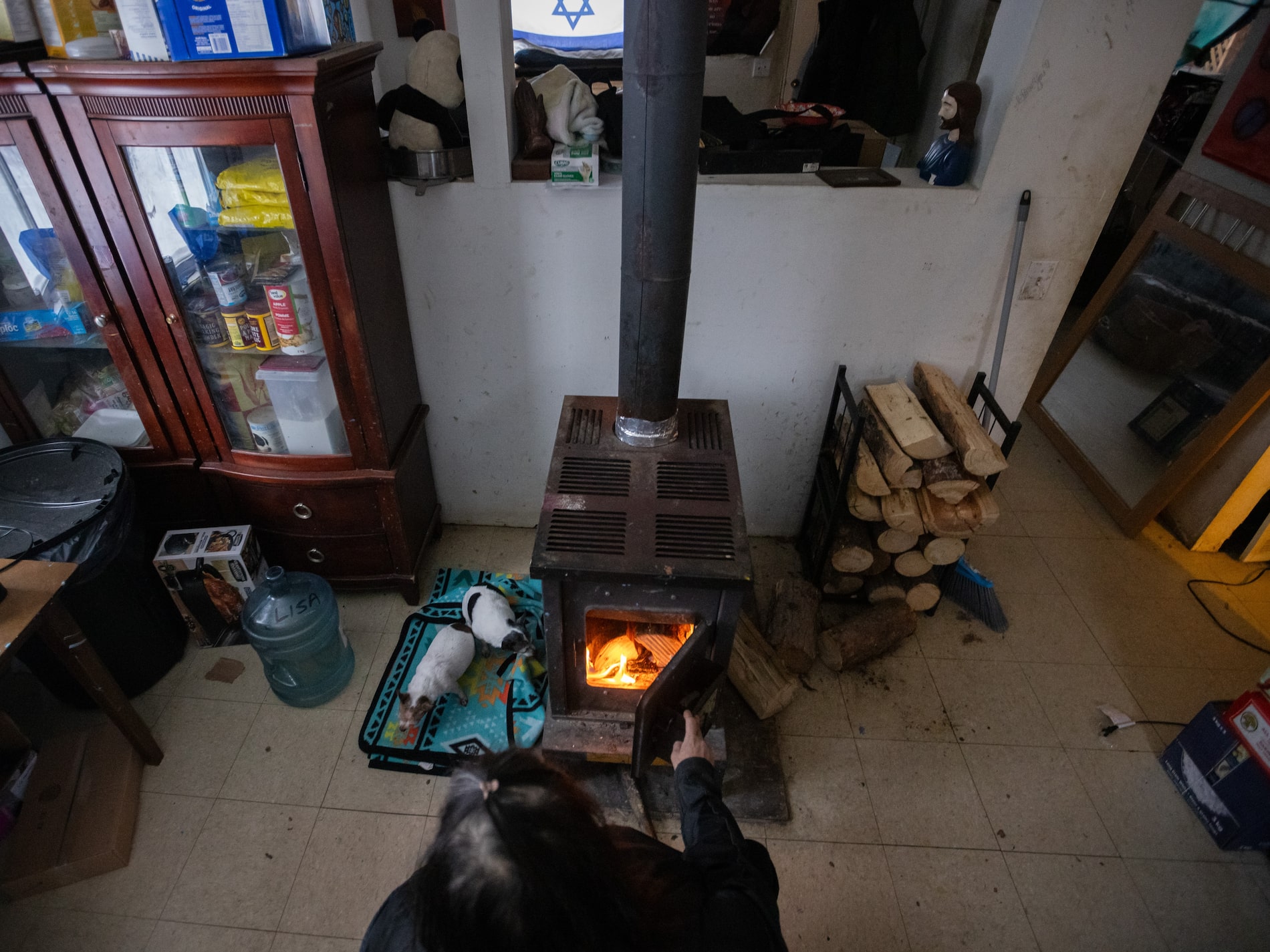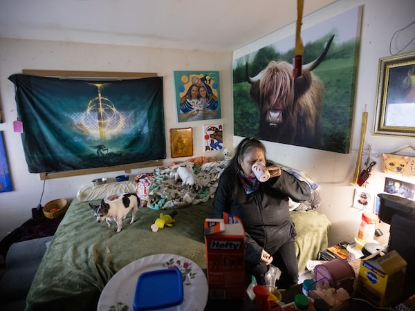 Lisa drives a Chevy with extensive dents and a passenger seatbelt that won’t latch, and the roof and walls are cracking in her small band home, which is heated by a wood stove in the kitchen and lined with boxes and ephemera of a hardscrabble life. Pots and pans cover each inch of her countertop. As we chat, her two chihuahuas skitter around unopened cartons of Lysol, some Kraft Dinner and a lamp with no bulb, its shade hanging askew.