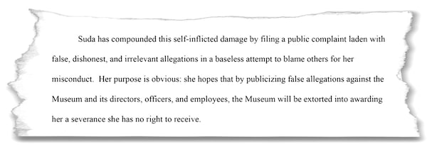 The museum responded with its own filing, describing Suda as making “delusional allegations of victimhood and persecution” and lacking the “character and judgment to hold a position of trust or confidence at any institution.”