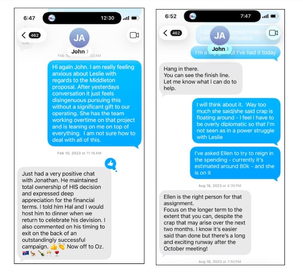 Tensions mounted. “Way too much she said/she said crap is floating around – I feel like I have to be overly diplomatic so that I’m not seen as in a power struggle with Leslie,” reads an August, 2023, text message from Suda to Alchin, the chair of the board’s finance committee.