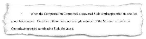 Last fall, the museum fired Suda for cause, alleging she had misappropriated funds by giving herself a series of unauthorized raises.