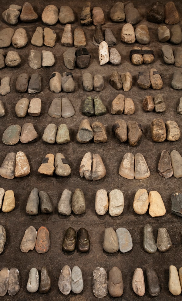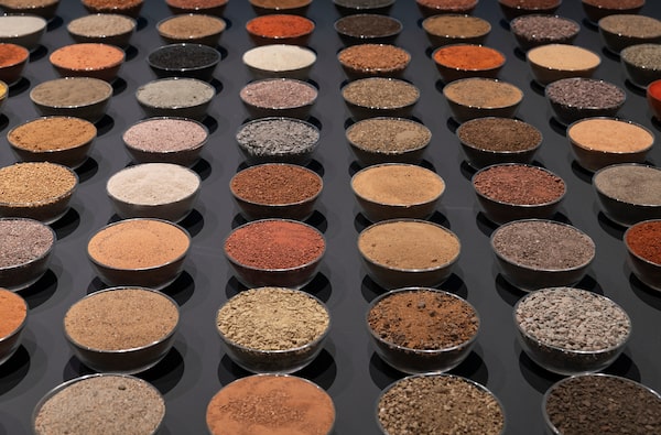 Almost 50 years later, 500 of them are displayed in small glass bowls at the National Gallery of Canada, an earthy United Nations arranged in tidy rows on a low black platform. The beautiful array, resembling the wares of some well-travelled spice merchant, offers the most remarkable range of colours and textures, from flinty chips of green and grey to yellow and red sands, along with a few bowls filled with plain old dirt.