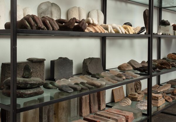Titled Assemblages, and dating from 1986 to the present, the shelves hold found objects, such as a collection of bricks and natural specimens including rocks, pebbles, branches and seed pods. These items sit alongside glass, bronze and concrete sculptures of hands, fruit and the seed pods themselves.