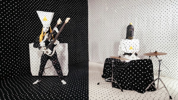 The band dresses in elaborate polka-dot costumes, complete with oversized headpieces that completely obscure their faces.HO/The Canadian Press