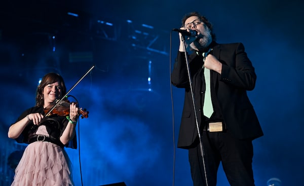 Les Cowboys Fringants, performing at the Quebec Summer Festival in Quebec City in 2023, led by singer Karl Tremblay and violinist Marie-Annick Lepine.Jacques Boissinot/The Canadian Press