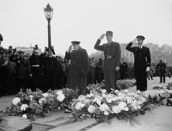Britain’s Prime Minister Winston Churchill, centre left, and General Charles De Gaulle, centre right, salute at the Arc De Triomphe in Paris on Nov. 12, 1944.The Associated Press