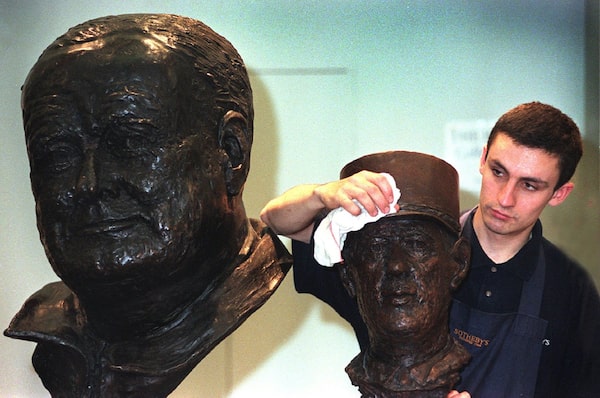 A Sotheby’s worker cleans a bronze bust of French General Charles de Gaulle next to a bronze bust of Sir Winston Churchill, on July 8, 1999.Sinead Lynch/AFP / Getty Images