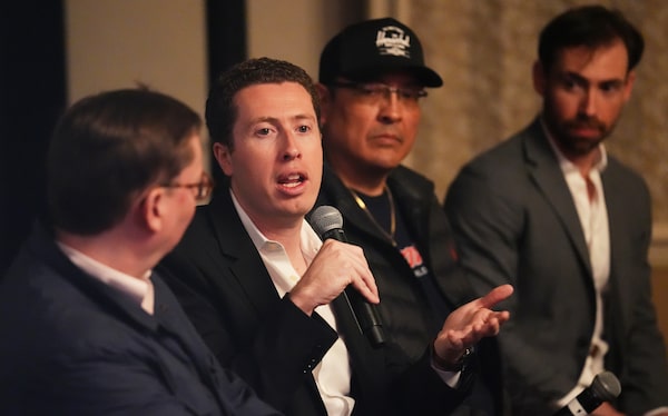 Coerte Voorhees, second from left, writer/director of the upcoming film "As Deep as the Grave," discusses the film with John Tsosie of Navajo Nation, second from right, and producer John Voorhees, far right, and moderator Brent Lang at CinemaCon 2026 on Wednesday in Las Vegas.Chris Pizzello/The Associated Press