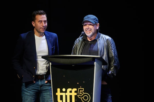Producer Mark Selby, left, and director Barry Avrich after winning the 2025 People's Choice Documentary Award for The Road Between Us: The Ultimate Rescue during the Toronto International Film Festival's awards ceremony on Sept. 14.Sammy Kogan/The Canadian Press