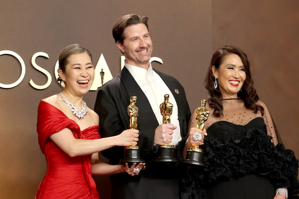 From left to right: Maggie Kang, Chris Appelhans and Michelle L.M. Wong, winners of the best animated feature film award for KPop Demon Hunters, during the 98th Oscars at Dolby Theatre on Sunday.Frazer Harrison/Getty Images