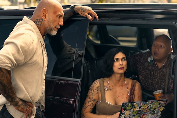 Dave Bautista, far left, Morena Baccarin, and Jacob Batalon in a scene from Prime Video film Wrecking Crew.Jason Laciste/Amazon Prime