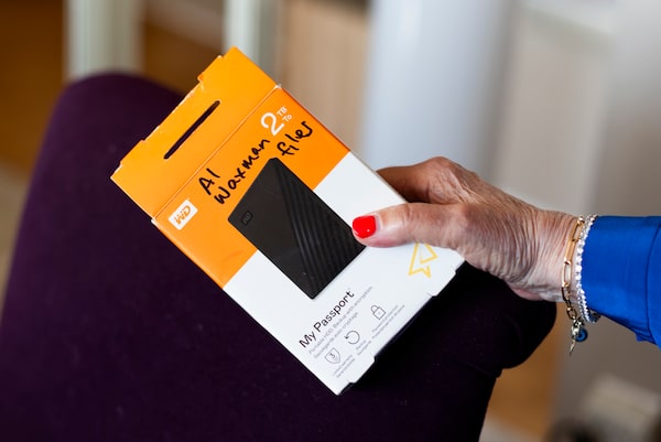 Al Waxman's wife, Sara, holds an external hard drive in a box, containing digitized episodes of King of Kensington and other Al Waxman files.sarah bodri/The Globe and Mail