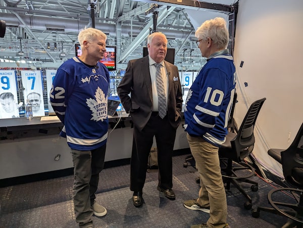 Mike Myers, voice of the Toronto Maple Leafs Joe Bowen, and Dave Foley in Hockey Fanatics.Crave
