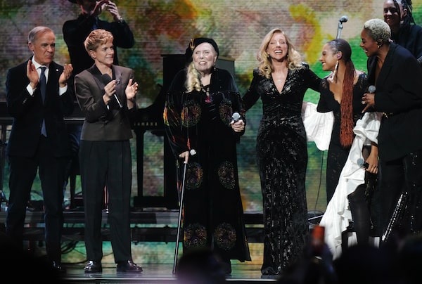 Joni Mitchell, centre left, performs with Sarah McLachlan, centre right, Allison Russell, second right, and Jully Black, right, as Prime Minister Mark Carney, left, and host Mae Martin look on.Chris Young/The Canadian Press
