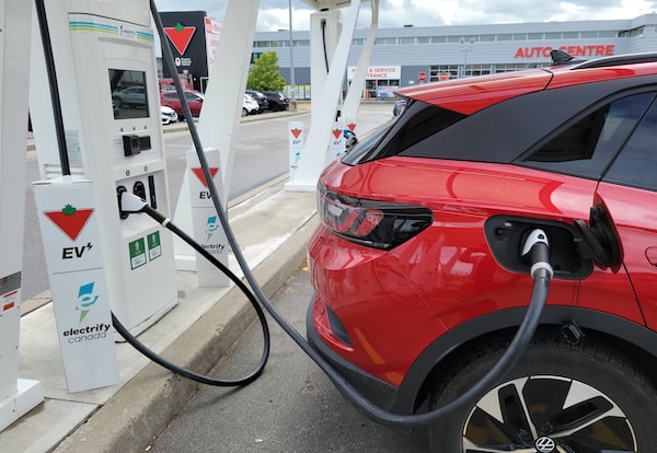 A 2022 Volkswagen ID. 4 EV is shown at a charging station at a Scarborough, Ont., Canadian Tire on June 14, 2023.Doug Ives/The Canadian Press
