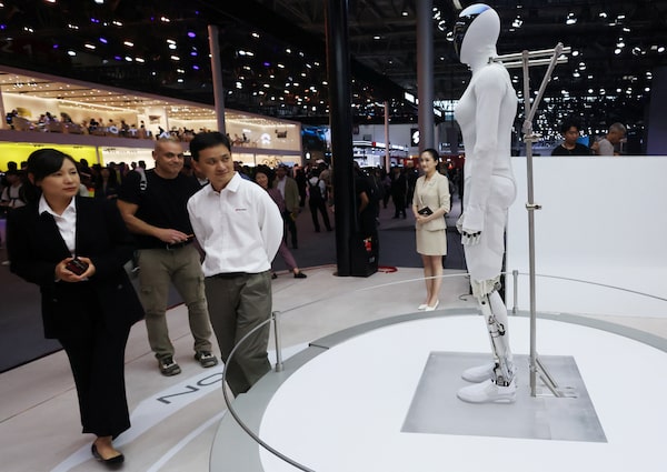 People walk past IRON, a female‑shaped humanoid robot, on display at the Xpeng booth during the Beijing International Automotive Exhibition (Auto China) in Beijing, April 24, 2026.Maxim Shemetov/Reuters