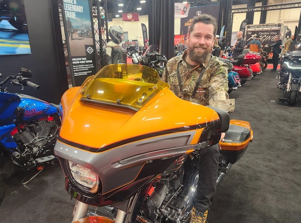 Adam Kostanowicz, manager director Harley-Davidson Canada, on a cruising bike at the 2026 Calgary Moto Show.Doug Firby/The Globe and Mail
