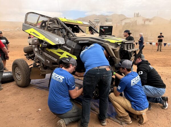 Brock Heger barrels into the pits in his Polaris RZR with a broken steering rack. A team of mechanics swarm the vehicle and swap in a new rack and tires in just 25 minutes, but Heger’s chances of continuing his winning streak are low.