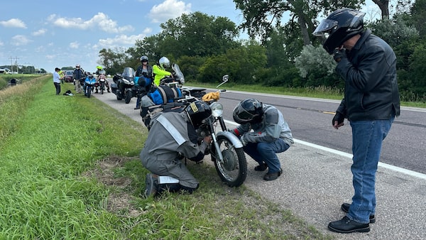 Ben Boyer tries to fix his SuperHawk beside the road in Minnesota, with help from Kosmoski.Mark Richardson/The Globe and Mail