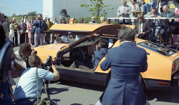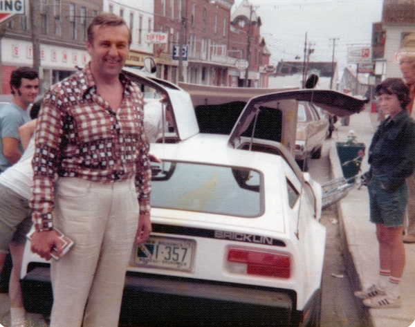 Richard Hatfield, left foreground, in Hartland, N.B., in 1975 with the Bricklin automobile.